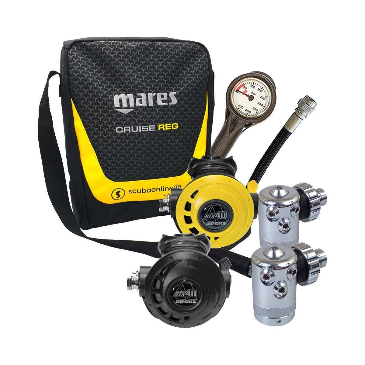 Atemregler Konfiguration Apeks ATX40 DS4 DIN mit Octopus + zusätzlicher 1.Stufe DS4, inkl. Finimeter, Inflatorschlauch und Atemreglertasche