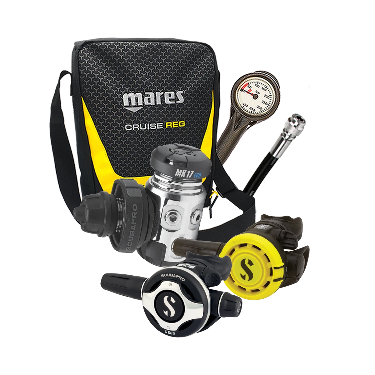 Der Scubapro Atemregler MK17 EVO / S600 mit Octopus R105 inkl. 400bar Finimeter, Atemreglertasche und Inflatorschlauch