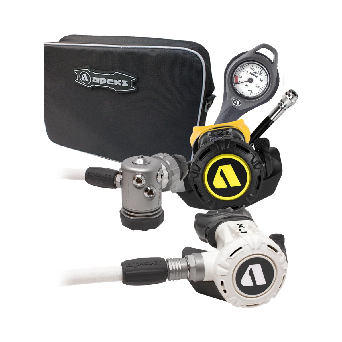 In diesem Atemregler Set, erhalten Sie den Lungenautomaten Apeks XL inkl. Octopus mit einem passenden Apeks Finimeter, einem Inflatorschlauch und einer hochwertigen Apeks Atemreglertasche.