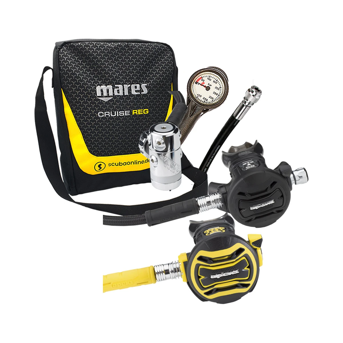 In diesem Komplettset bieten wir Ihnen den Apeks XTX50 XTX40 Atemregler zusammen mit einem präzisen Finimeter, einem hochwertigen Inflatorschlauch und einer praktischen Mares Atemreglertasche.