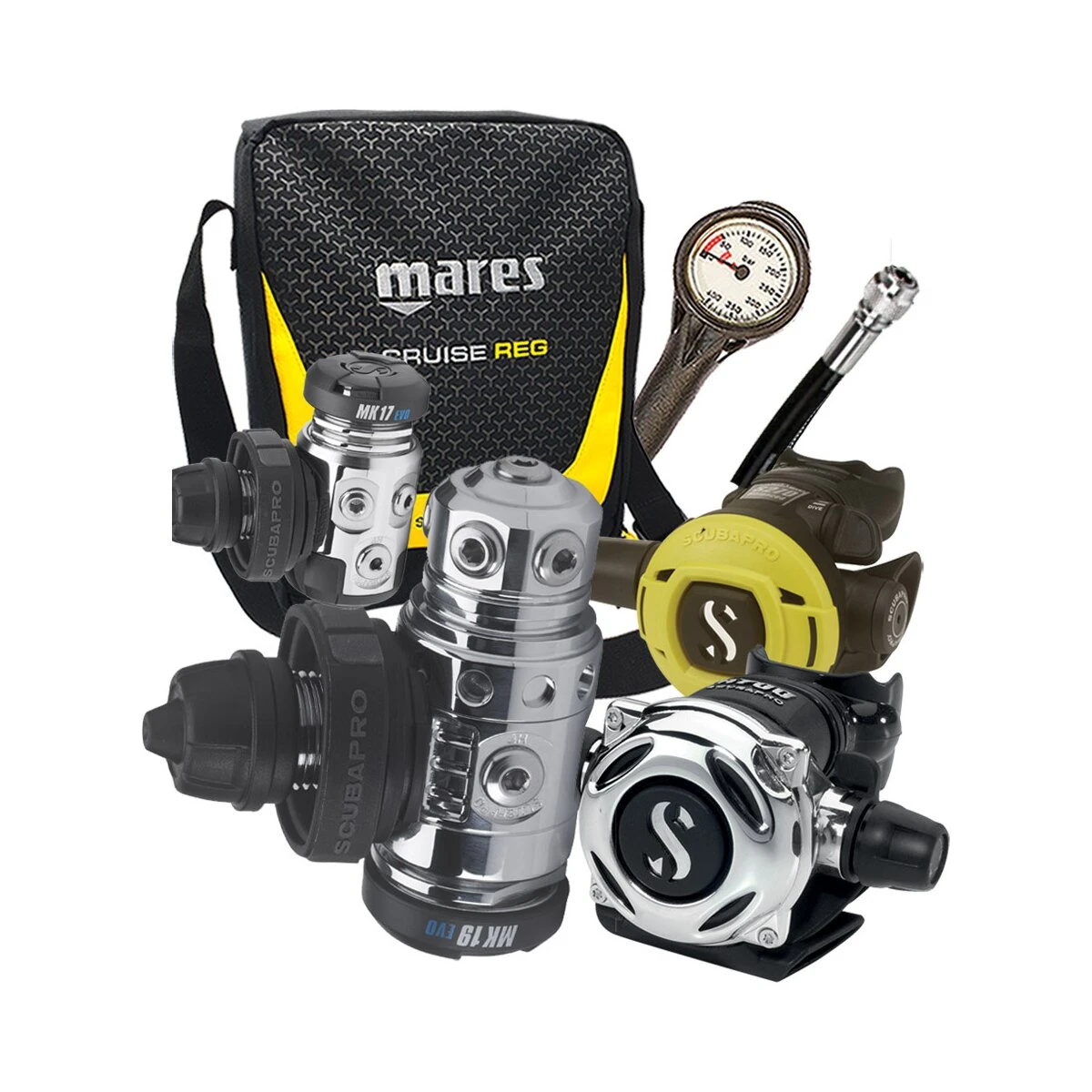 Dazu gesellen sich die die neue, kompakte alternative Luftversorgung Scubapro S270, als zweite erste Stufe die performante 1.Stufe MK17 EVO für einen Kaltwasser Atemregler mit zwei getrennten 1.Stufen, ein präziser 400 bar Finimeter, ein robuster Inflatorschlauch und eine praktische Atemreglertasche.