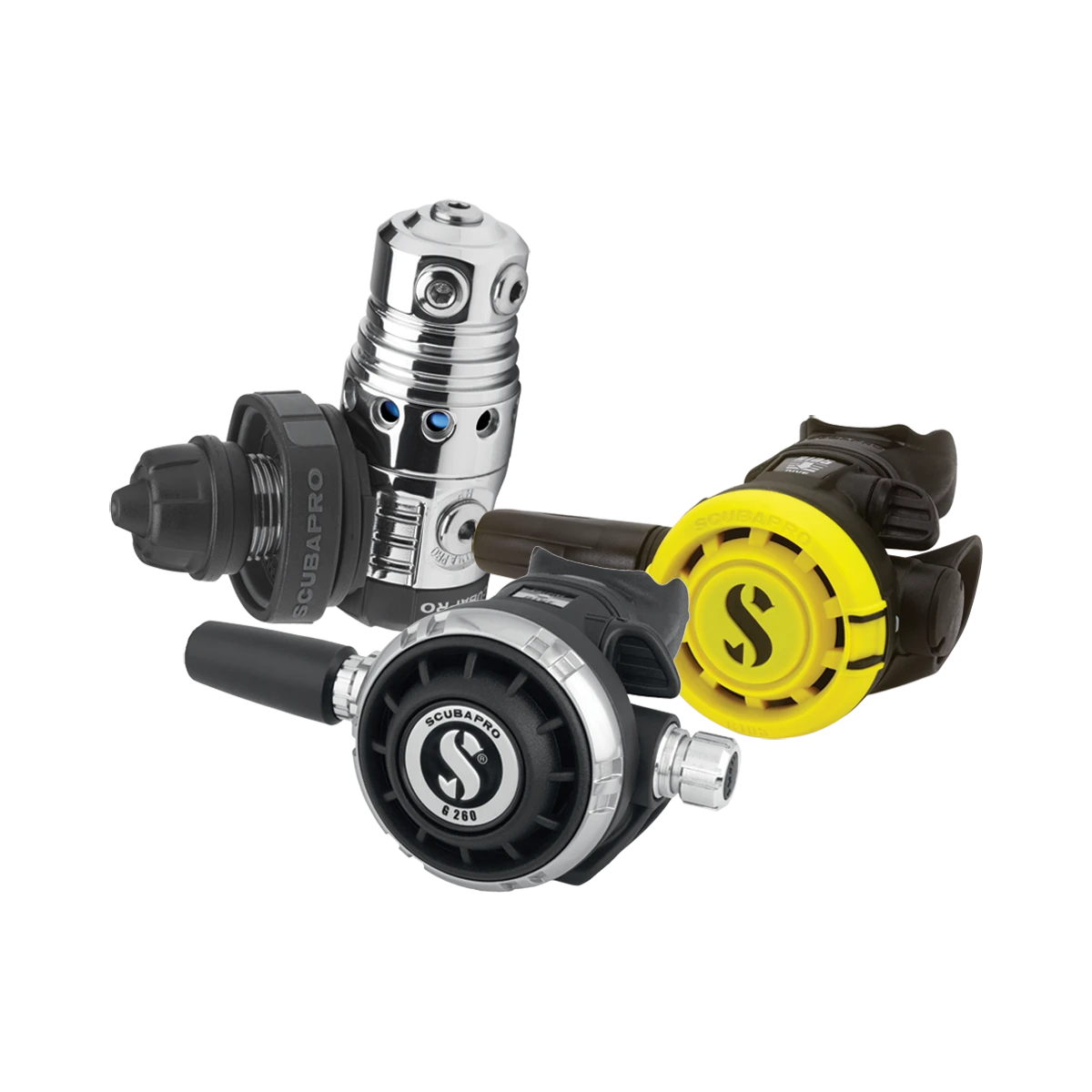 Dieser hochwertige Scubapro Lungenautomat besteht aus der kolbengesteurten 1.Stufe MK25 EVO, der klassischen Scubapro 2.Stufe G260 und dem leichten und praktischen Octopus R105.