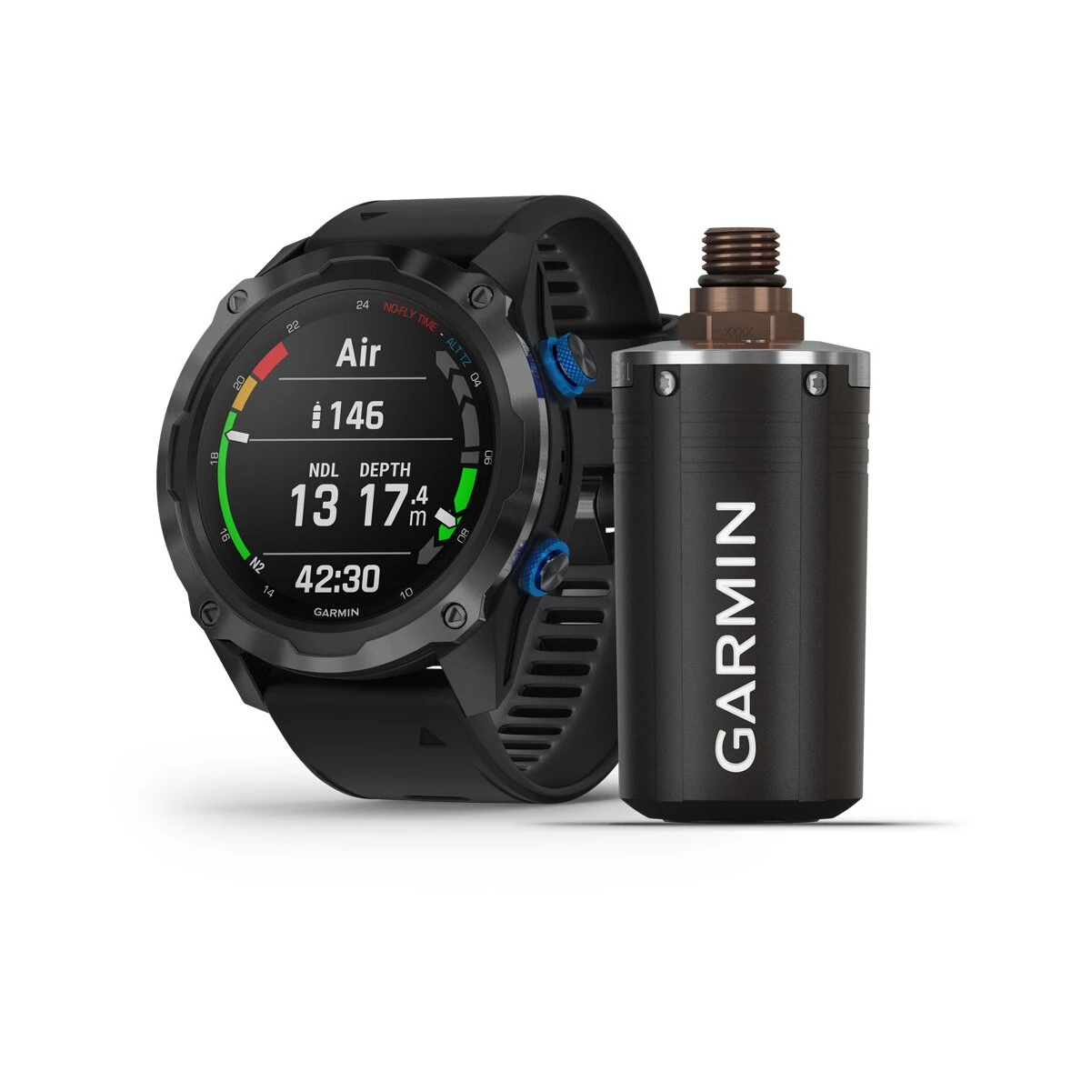 Luftintegration: ja, mit dem Garmin T1 Transmitter und Garmin Connect, Anzeige verbleibende Gaszeit, Gasverbrauchsrate