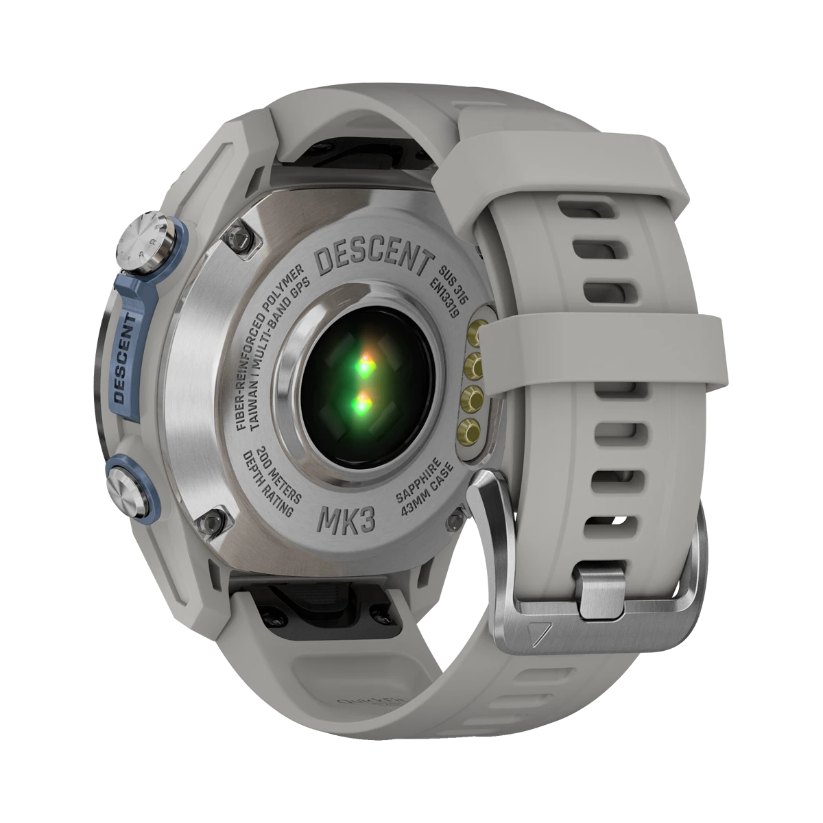Dazu sind alle Garmin MK3 Modelle mit einem optischen Herzfrequenzsensor am Handgelenk ausgestattet können aber alternativ, zum Beispiel wenn der Tauchcomputer über einen Neoprenanzug getragen wird, mit einem Garmin Brustgurt zur präzisen Herzfrequenzmessung verwendet werden.