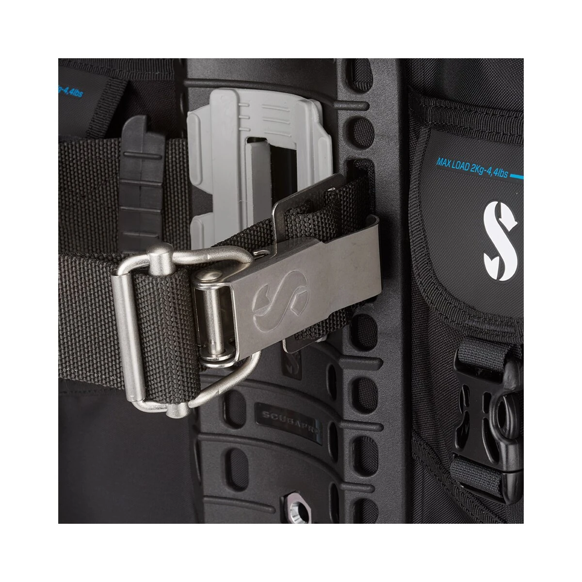 An fast alle Größen des Level Tarierjackets, mit Ausnahme der XS Größe, können Tauchflaschen bis max. 15l, sicher und stabil befestigt werden mit dem praktischen und leicht einstellbaren Super Chinch Flaschengurt mit robuster Edelstahl Schnalle.