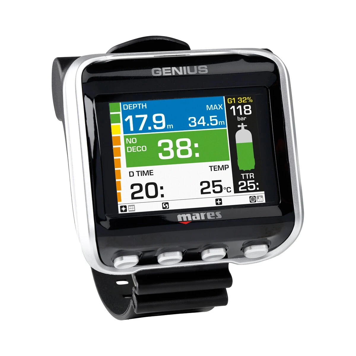 Der neue Mares Genius Tauchcomputer wurde als Hochleistungs-Tauchcomputer gedacht, denn er bietet weit mehr als ein Standard-Tauchcomputer. Der Mares Genius Tauchcomputer ist auch ein idealer Tauchlehrer Tauchcomputer oder Tauchcomputer für Tech-Taucher, denn er ist Nitrox- und Trimix-fähig (Hypoxic, Normoxic), Multigas fähig (bis zu 5 Gase) und kommt bereits in der Planungsphase auch den anspruchsvollsten Tauchern entgegen. Denn der neue Mares Genius Tauchcomputer bietet jenseits üblicher Tauchgangsplanung einen Dekompressionstauchgangs Planer mit zusätzlicher Oberflächeninterval Funktion und brand-neue und patentierte erwartete Deko und „Runaway-Deko-Alarm“ Features.