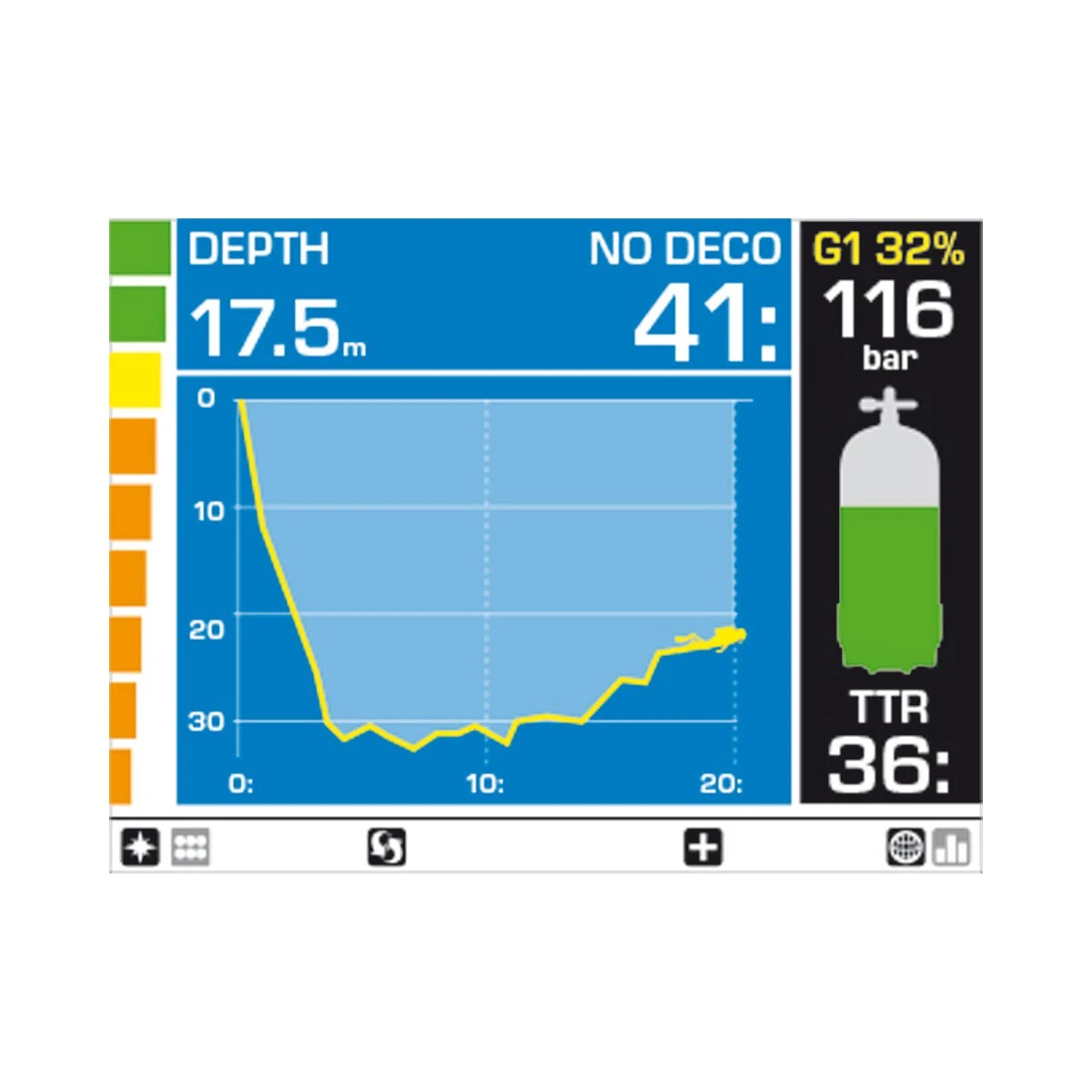 Zum Beispiel kann Ihnen der neuen Genius Tauchcomputer eine akkurate Tauchkarte während des Tauchgangs präsentieren, einen Digitalen Kompass mit vollständiger Neigungskompensation anzeigen, eine farbcodierte Anzeige des Tankdrucks gut lesbar einblenden, ein Gewebesättigungsdiagramm mit genauen, personalisierten Daten darbieten, oder sogar Ihre persönliche Daten einschließlich Foto darstellen.
