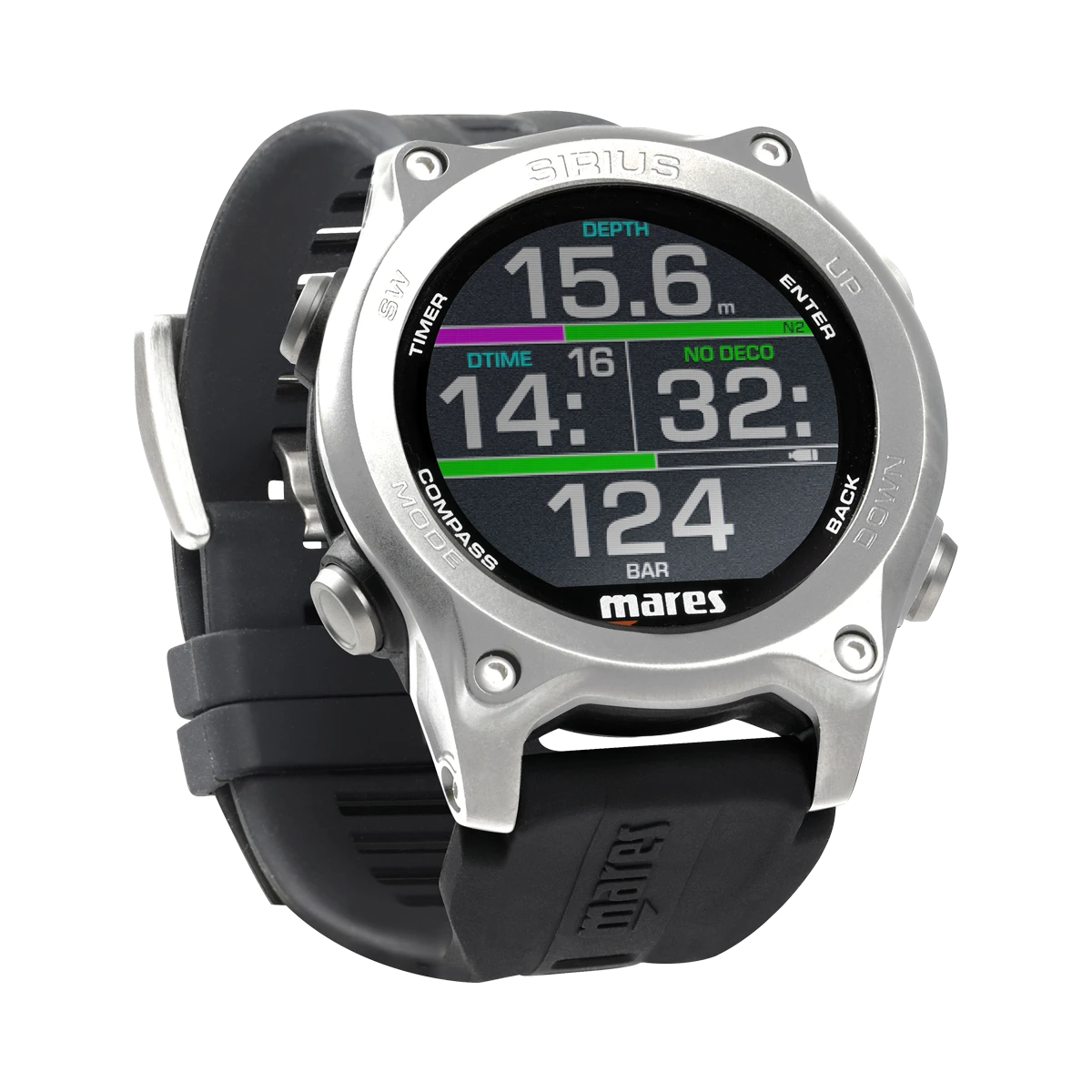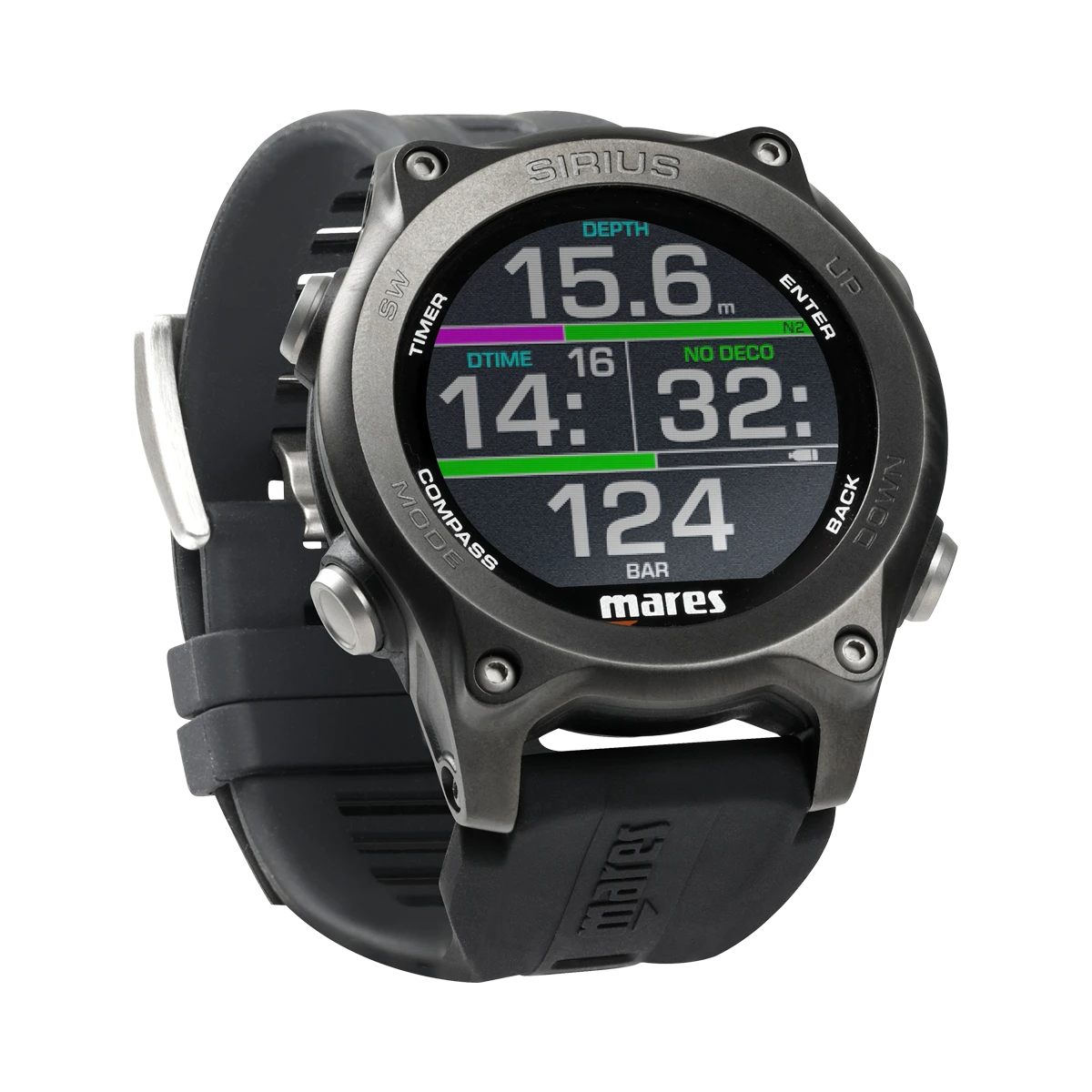 Der Mares Sirius ist ein brandneuer Mares Tauchcomputer in Uhrenformat, verfübgbar in usnerem online Tauchshop auch mit dem passenden Mares LED Sender als Mares Sirius mit Transmitter, ein Tauchcomputer für technisches Tauchen, Nitrox– und Trimix-fähig, mit Gradient Faktoren Berechnung und mit schlauchloser Luftintegration mit bis zu 3 Sendern gleichzeitig.