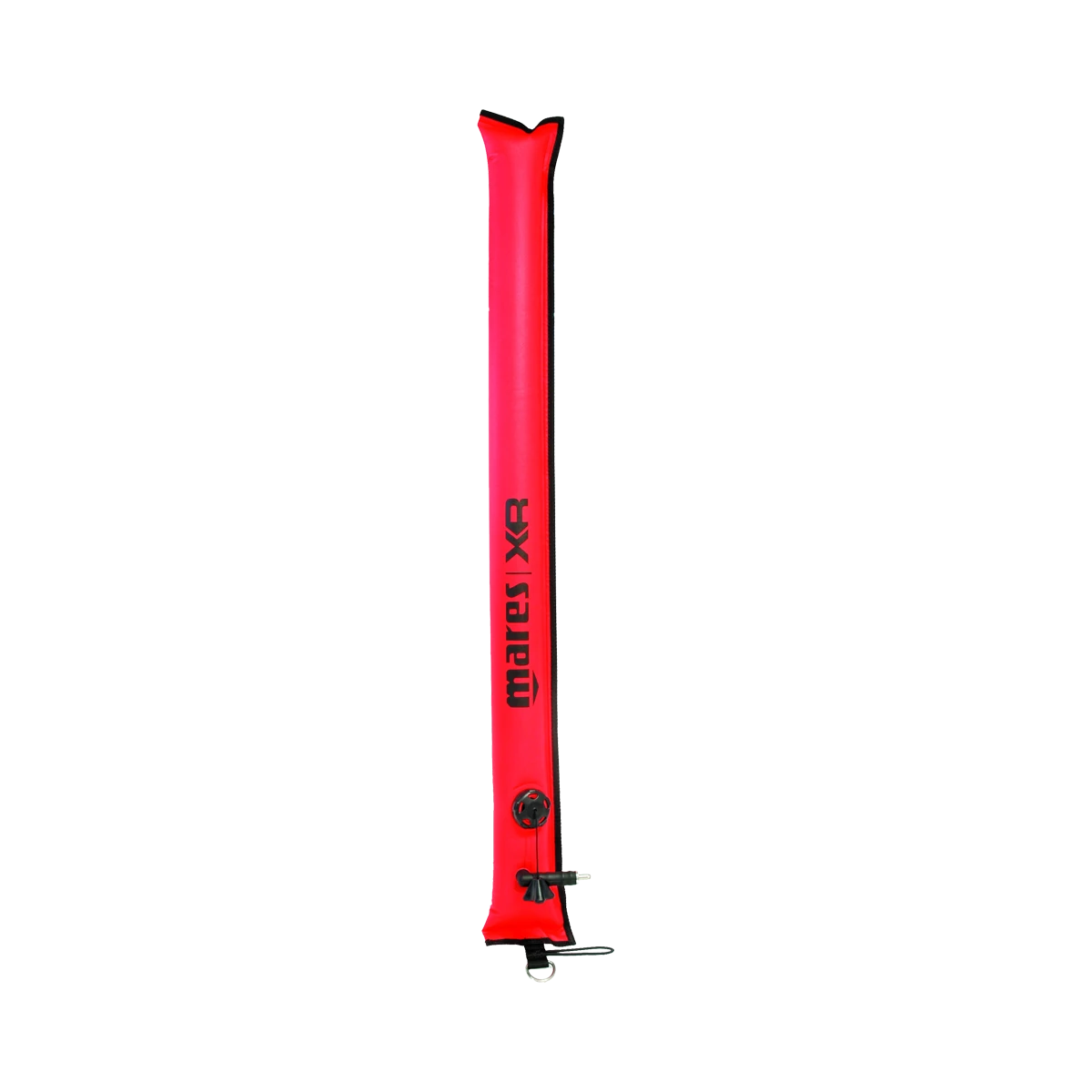 Die Mares 1m Signalboje besteht aus einem sehr robusten 210D Nylon Material mit TPU Beschichtung, in gut sichtbarem Rot mit einem schwarzen Mares Schriftzug. Damit die Mares 1m SMB XR Trainingsboje beim Aufsteigen nicht platzt, ist sie mit einem Überdruckventil ausgestattet, der auch manuell betätigt werden kann. Der Überdruckventil Halter und der Schlauch der Mares SMB Trainings Boje bestehen aus robustem TPU.