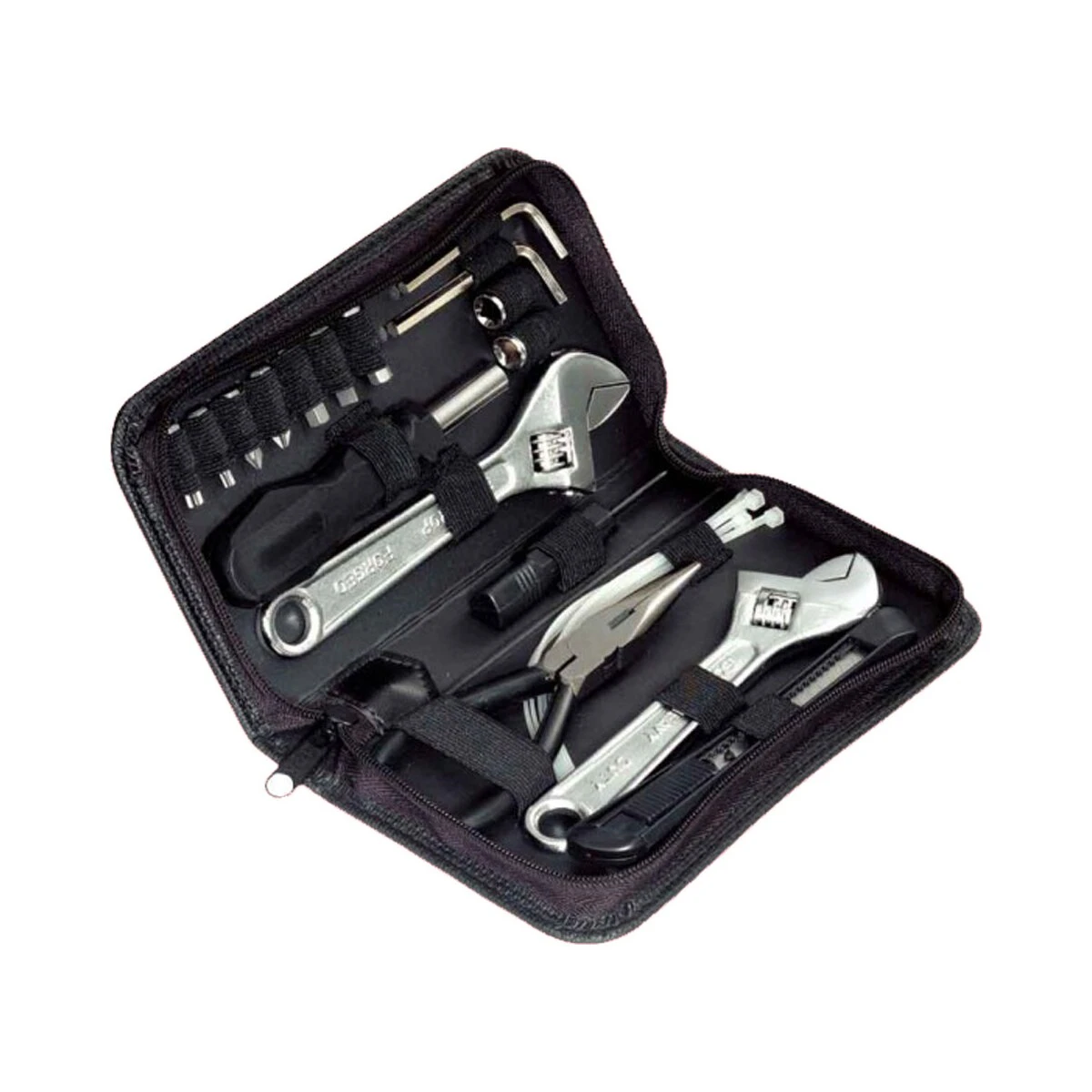 Inhalt: 2 Inbusschlüssel, 2 verstellbare Rollgabelschlüssel (Engländer), eine Spitzzange, einen Schraubendreher mit wechselbarem Aufsatz, ein paar Kabelbinder, ein Cuttermesser und einen O-Ring Entferner