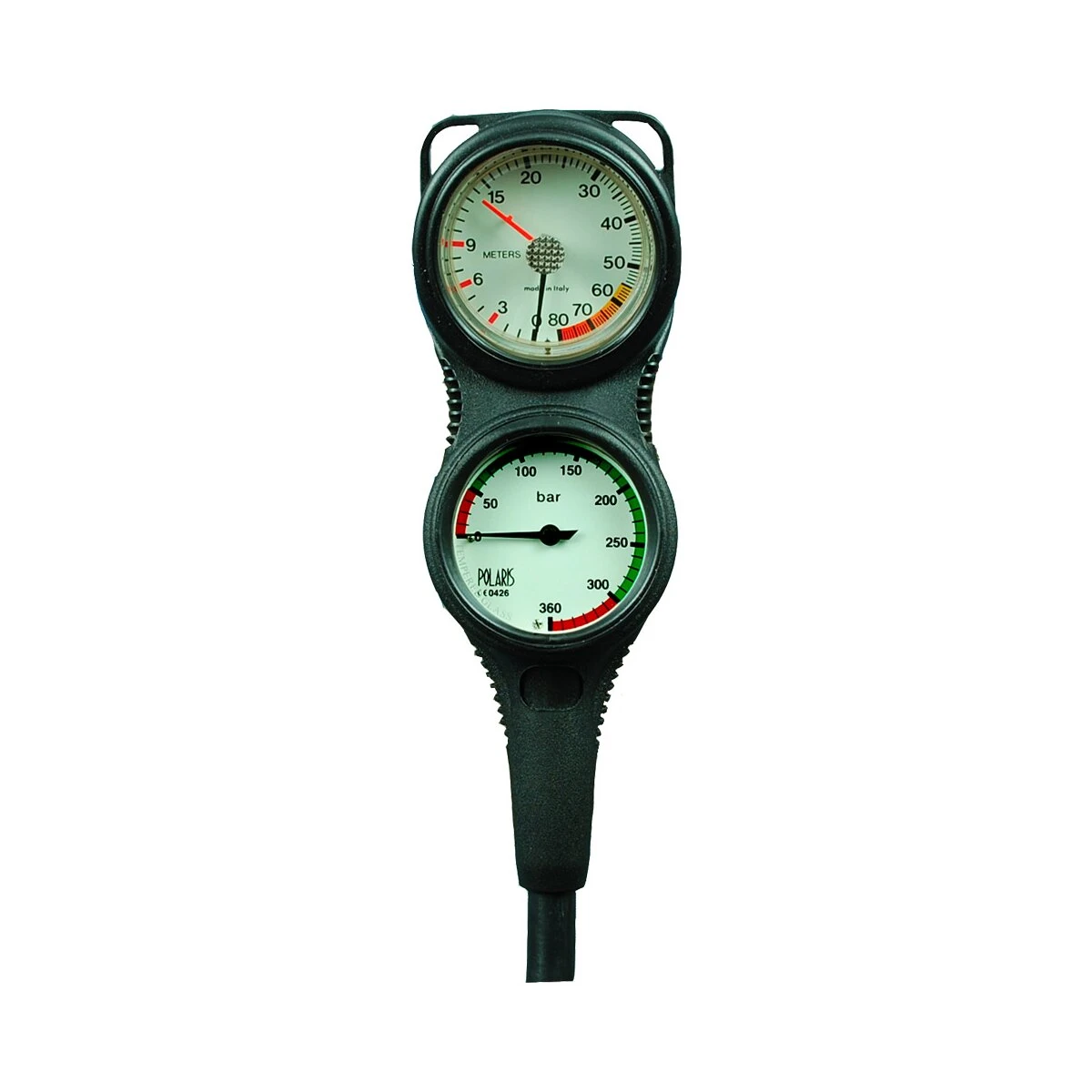 Die Polaris Konsole mit Finimeter und Tiefenmesser ist eine robuste und zuverlässige Tauchinstrumenten Konsole bestehend aus einem hochwertigen Polaris Membrantiefenmesser bis 80m und einem sehr präzisen Polaris Finimeter, also ein Manometer für Tauchflaschen für einen Druck bis 360 bar.