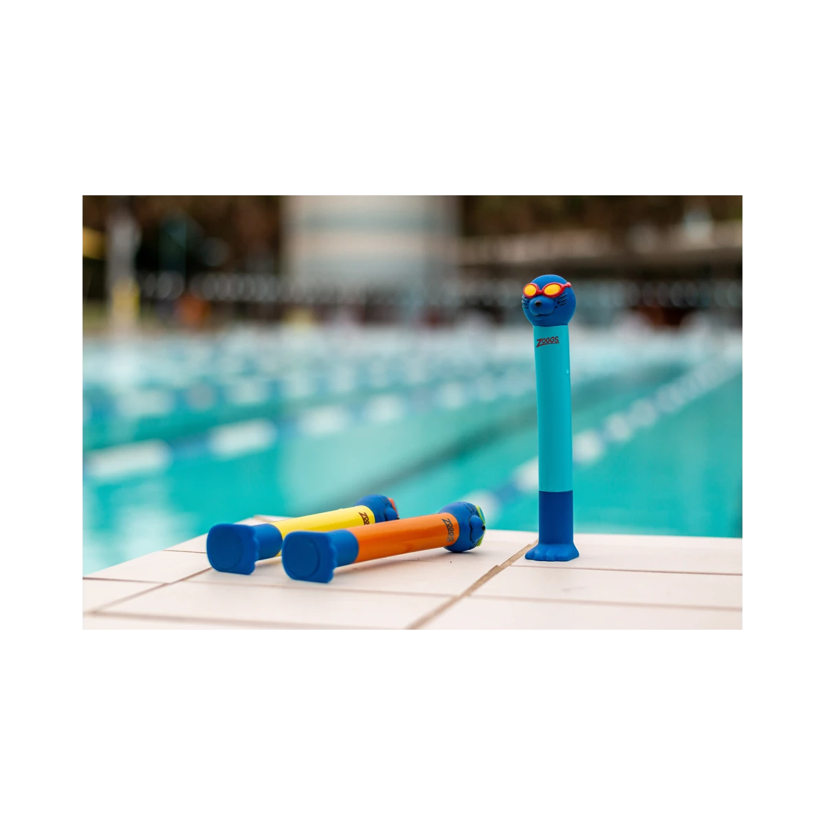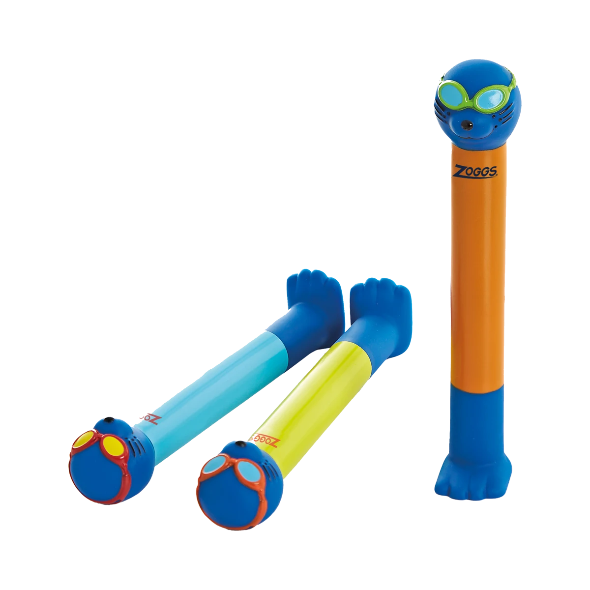 Im Gegensatz zu den klassischen Tauchringe, haben die drei Dive Sticks von Zoggs einen lustigen Robbenkopf, der meistens dafür sorgt, dass die Stäbe aufrecht im Wasser stehen bleiben sobald sie den Boden erreicht haben. Einmal ins Wasser geworfen, füllen sich die Zoggy Dive Sticks mit Wasser und sinken langsam zu Boden und animieren Ihre Kinder dazu ihnen hinterher zu tauchen.
